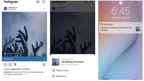Another innovation of Instagram will be reminder ads. Businesses will be able to use reminder ads to announce their upcoming events or launches and to notify people easily.Three notification will be sent to users from Insagram one day before, 15 minutes before,and at the time of the event.